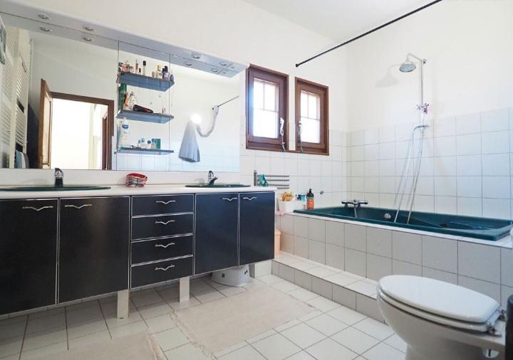 Magnifique maison de 130m² spacieuse et lumineuse sur une parcelle de 1 470m² située dans un quartier en impasse: entrée, cuisine entièrement équipée ouverte sur salon/séjour (cheminée), et wc séparé.