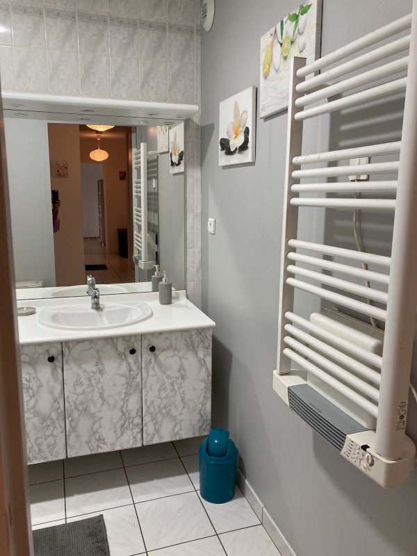 Chauffage individuel électrique avec des radiateurs à inertie dans les pièces de vie et sèche-serviettes dans la salle de bains.