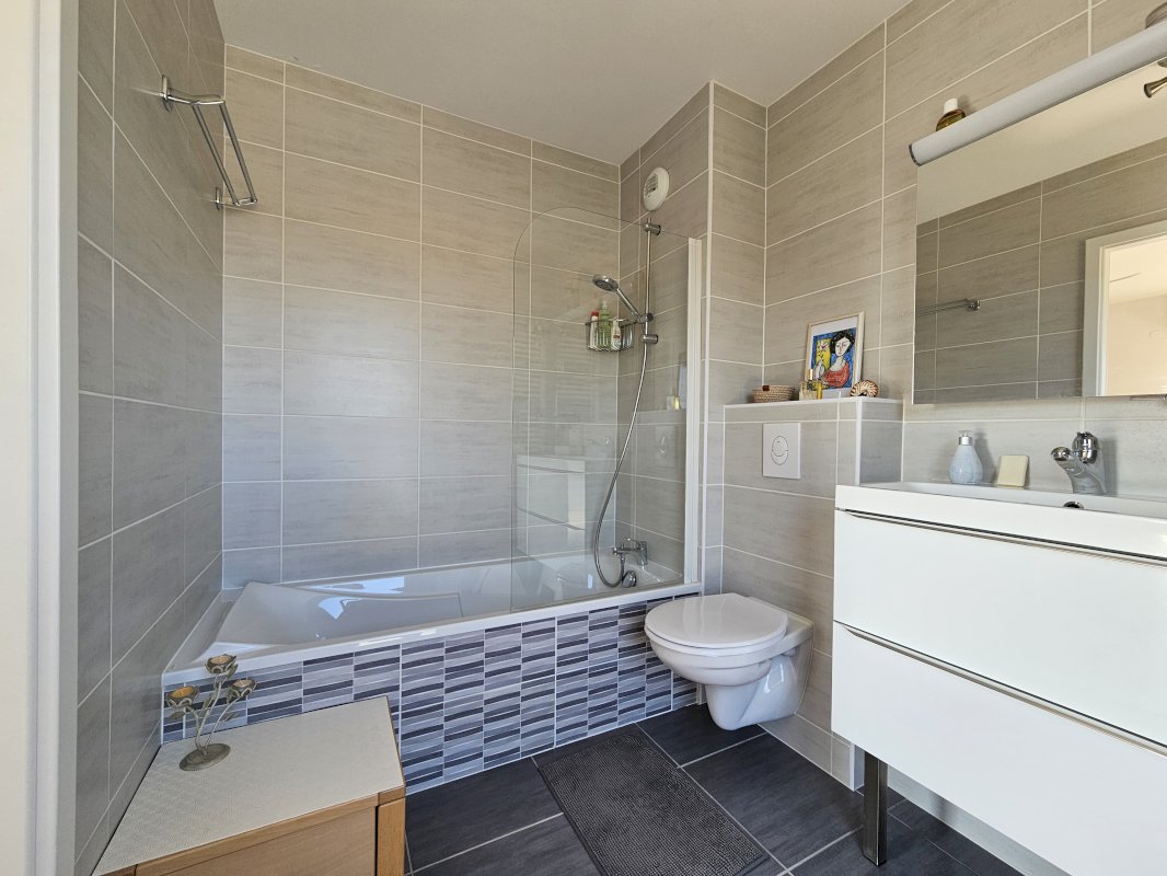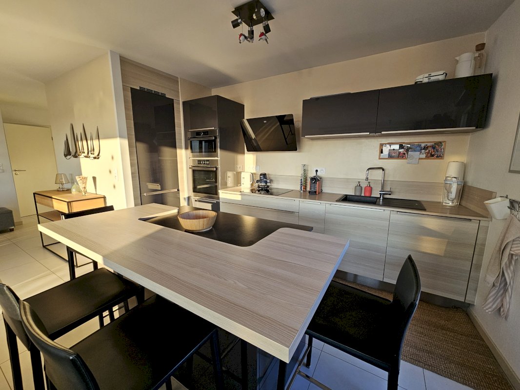 Comprenant : Entrée avec placard, salon-séjour avec cuisine équipée donnant sur un grand balcon (14,70 m2), suite parentale de 20 m² avec placard et salle de bains avec WC et accès à un grand balcon, (11,30 m2) 2 autres chambres avec rangements, salle de douche, wc séparé, cellier en rez-de-chaussée, en sous-sol: garage fermé automatisé + place de parking.
