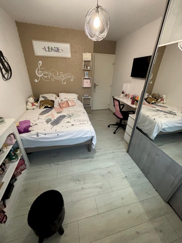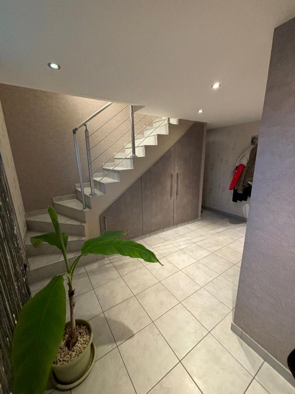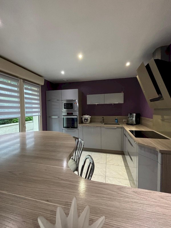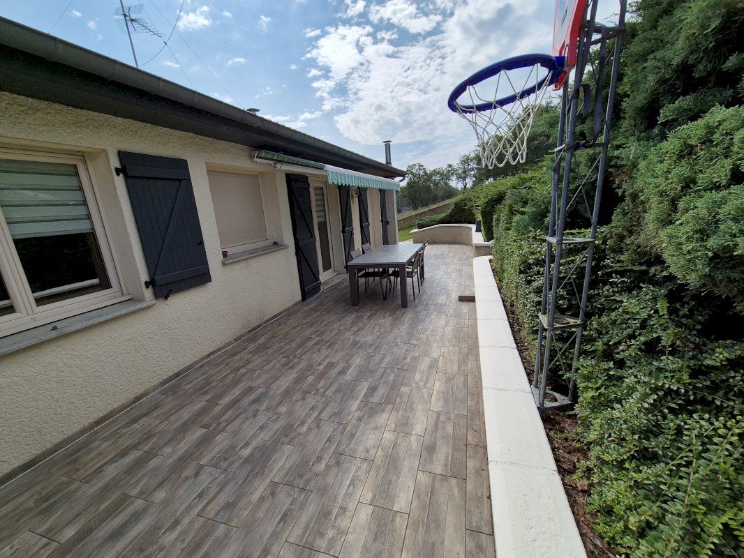 Cuisine équipée ouverte sur salon, salle à manger et son poêle à bois avec accès terrasse équipée d'un store électrique. Couloir desservant sur salle de bain avec baignoire et douche, WC suspendu indépendant et trois chambres équipées de placards à portes coulissantes. Au sous-sol halle d entrée avec deux placards , une salle de jeu ou chambre avec placard.