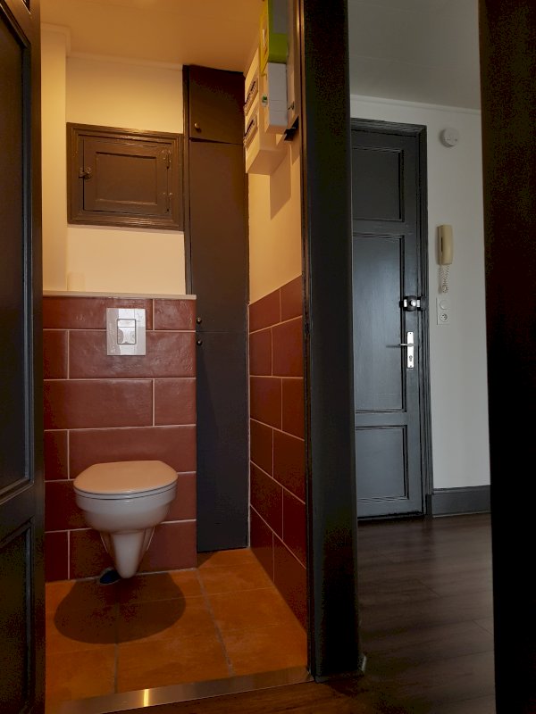 F4 traversant (NE/SO), 3ème étage, composé d’1 entrée/ dégagement spacieuse et lumineuse, qui dessert toutes les pièces, 1 salle de bain entièrement équipée (+ lave-linge), 1 WC séparé, 1 chambre/salon lumineux (expo NE), 1 cellier/penderie, 2 chambres, 1 espace cuisine toute équipée (neuve)/séjour/loggia donnant sur la verdure du jardin (expo.S/SO) + 1 cave ac accès direct par la rue (idéal pour le vélo) et 1 grenier privatifs.