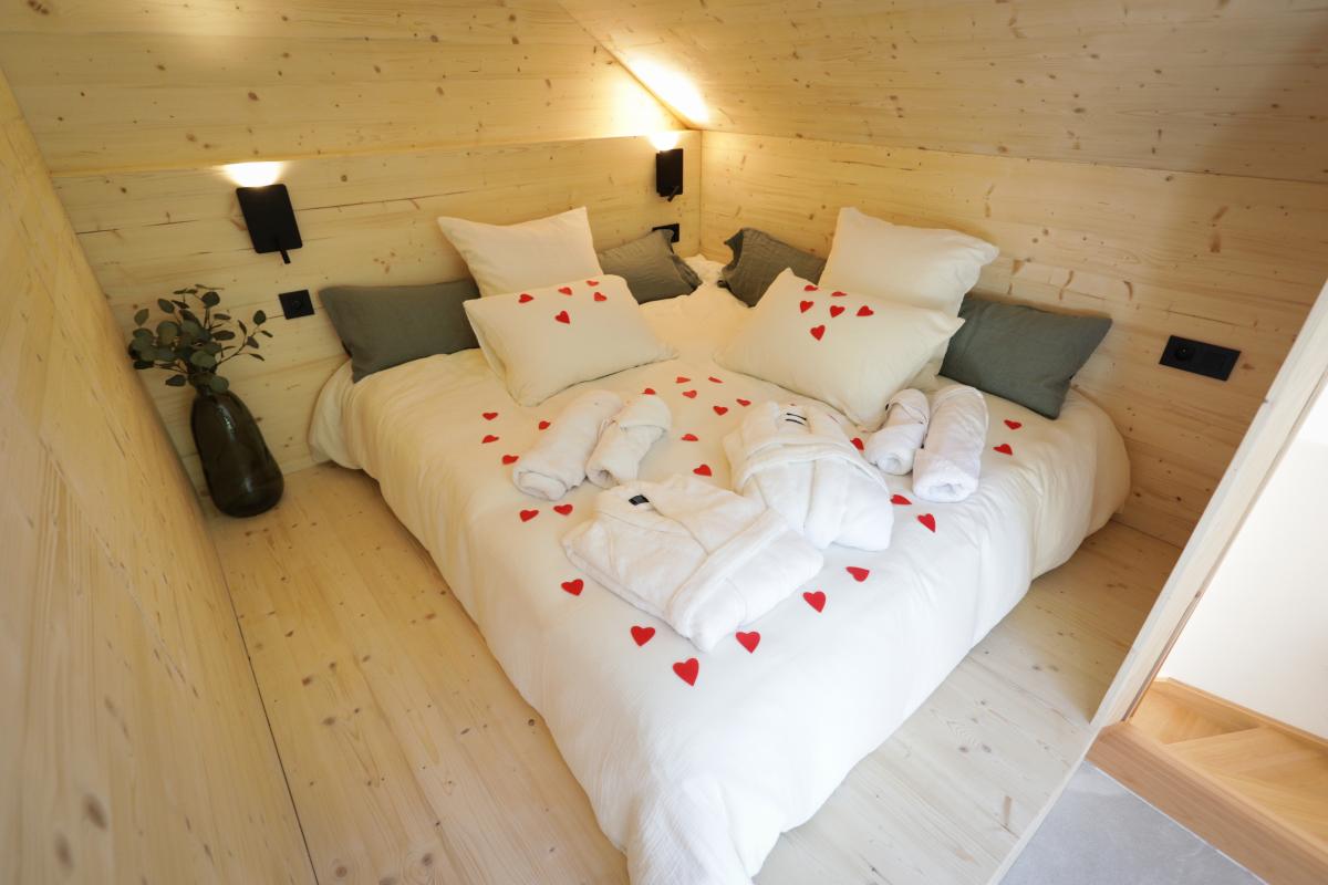 Le Gîte RDC : Salle à manger, cuisine équipée, jacuzzi sur terrasse couverte avec vue sur la forêt, WC. 1er étage : Chambre cosy, salle d’eau moderne.