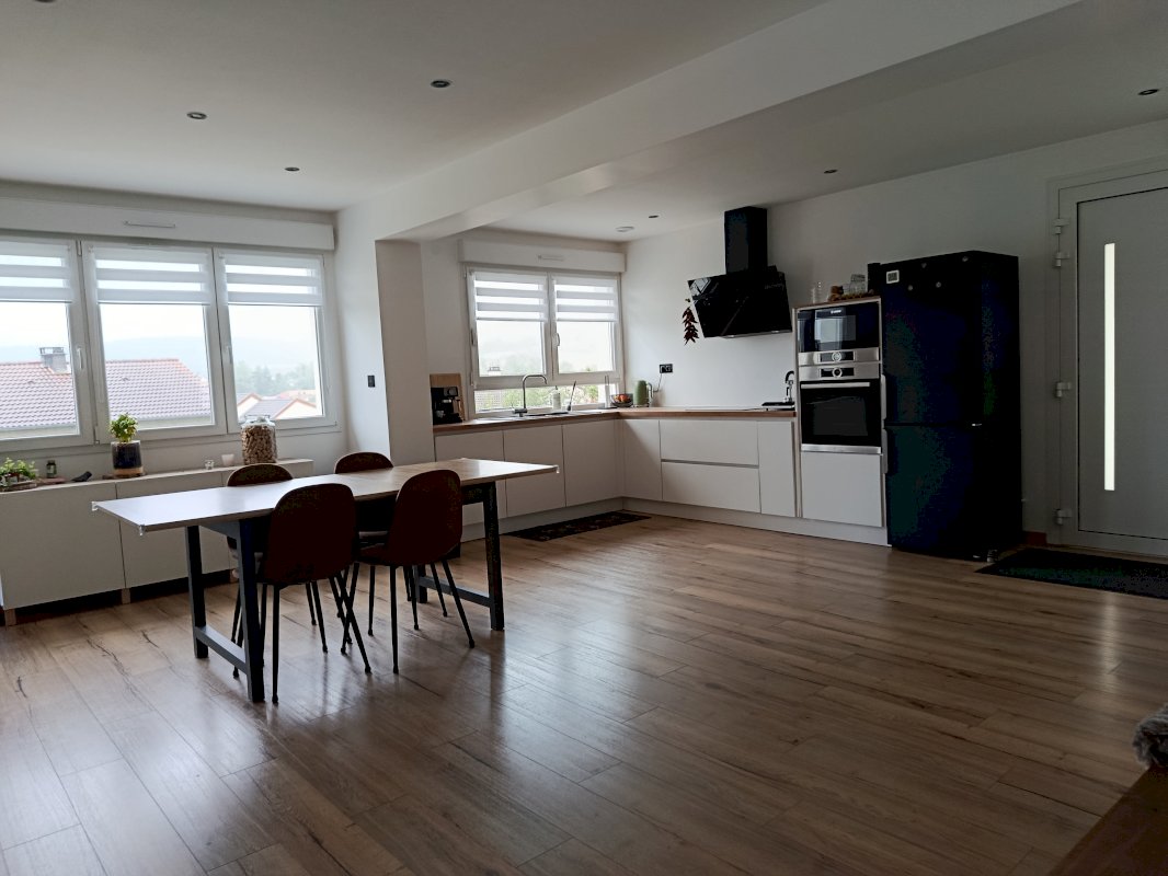 A l'étage : une belle cuisine toute équipée dans un espace complètement ouvert avec un beau séjour traversant de 49 m²avec poêle à bois. Espace très lumineux avec une grande baie vitrée donnant sue une terrasse qui fait toute la longueur de l'arrière de la maison. Une grande salle de bain avec une douche à l'italienne et une baignoire.