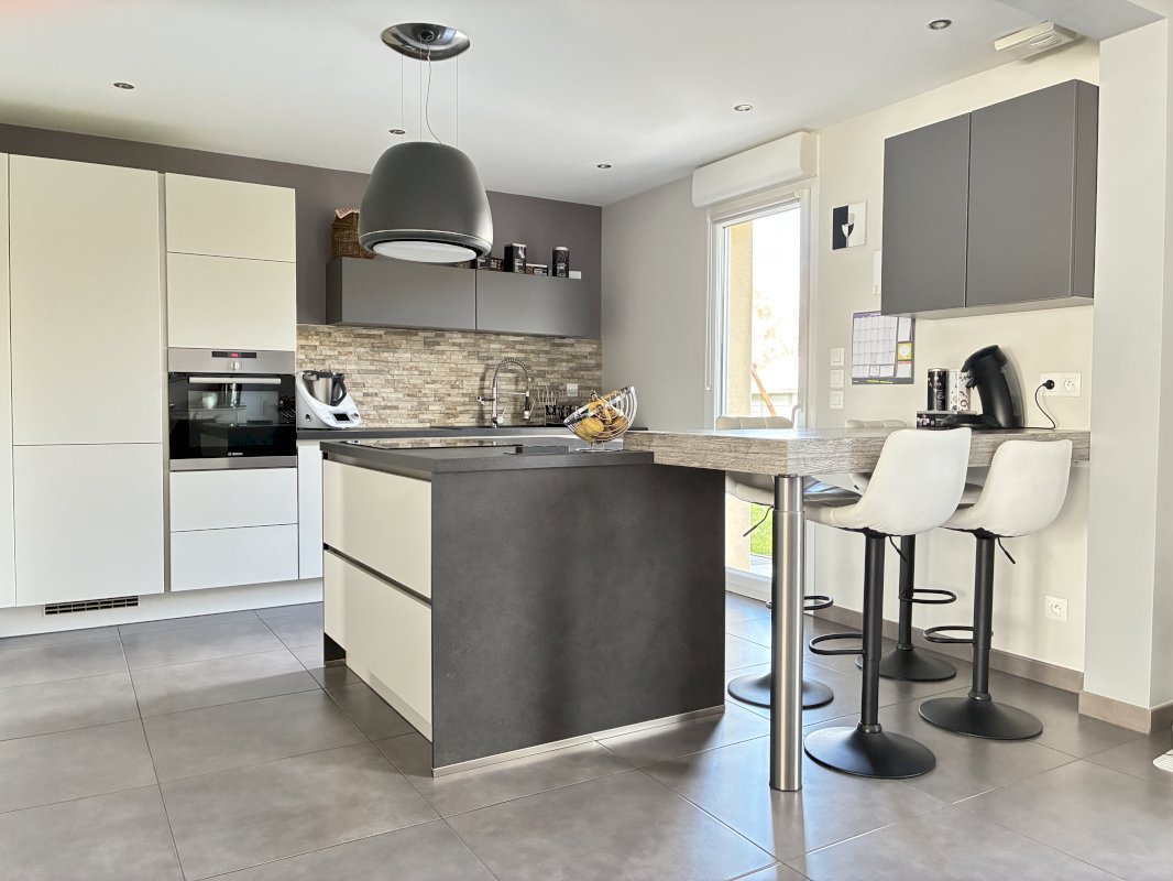 Implantée sur une parcelle de 616 m², cette maison propose au rez-de chaussée une grande entrée avec placard intégré, un espace de vie baigné de lumière comprenant un salon/séjour de 50m² et une cuisine moderne entièrement équipée avec accès direct à la terrasse de 30m² et au jardin, ainsi qu'un WC