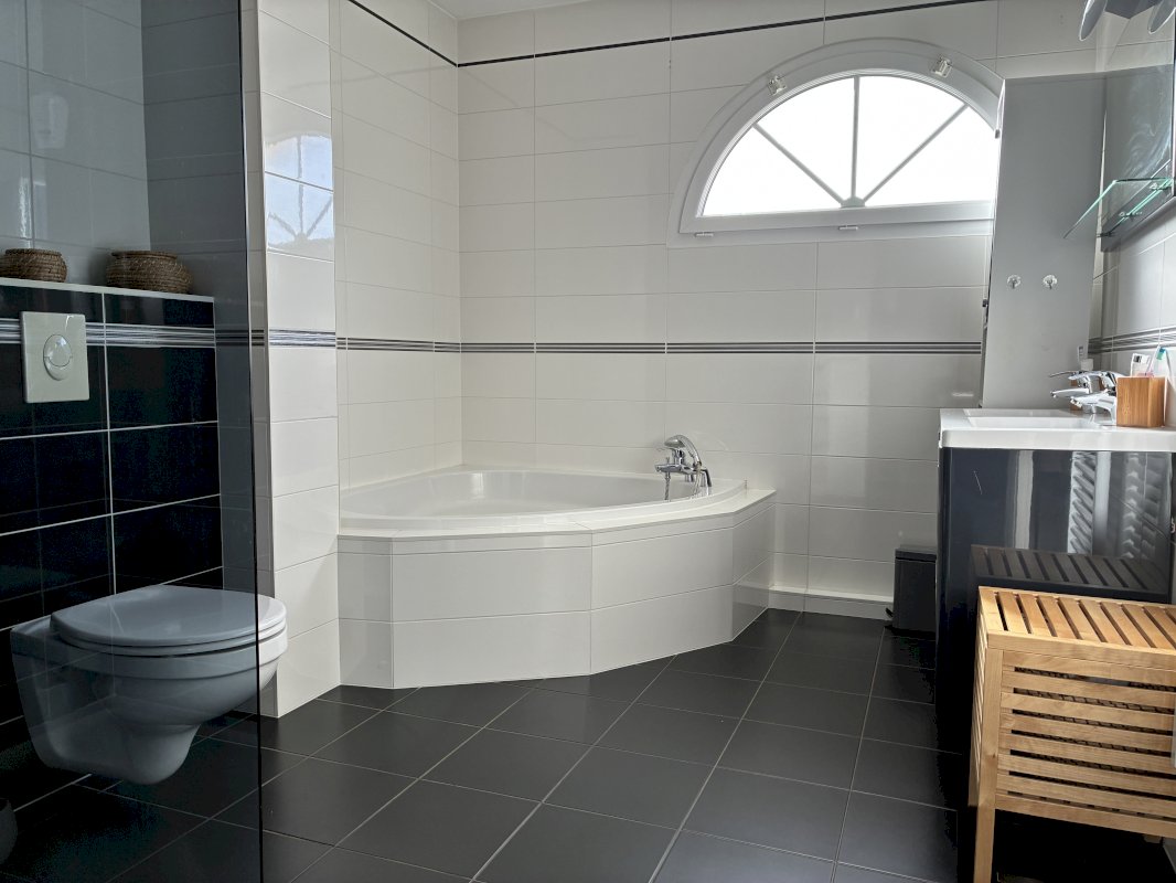 A l'étage, vous trouverez 3 belles chambres de 17m², 14m² et 12m² ainsi qu'une grande salle de bain moderne et entièrement carrelée avec meuble double-vasque, douche, baignoire et WC