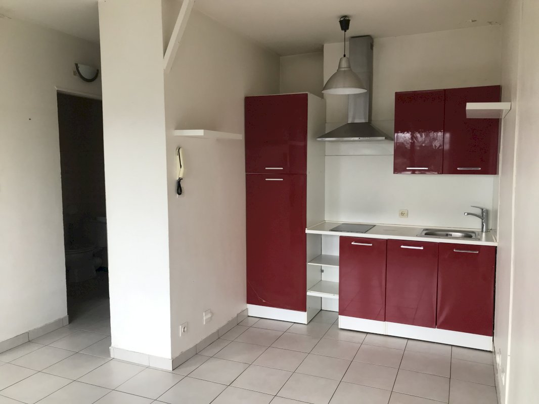 L’appartement comprend une grande salle séjour (Possibilité de chambre indépendante) avec coin cuisine semi équipée (éléments, plaque vitro céramique, hotte) donnant sur un grand balcon (8m2) au calme sur l arrière