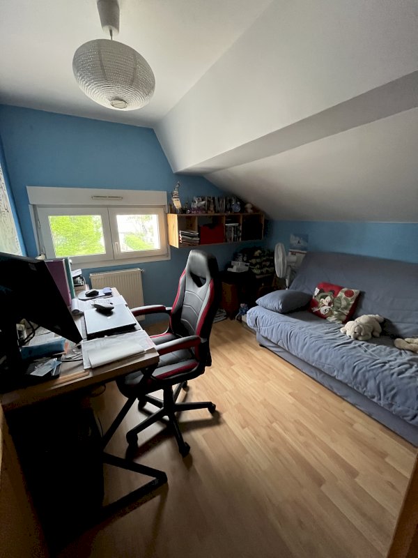 Au 1er étage, une chambre parentale avec salle de bain attenante, une chambre enfant et une chambre mansardée/ bureau.