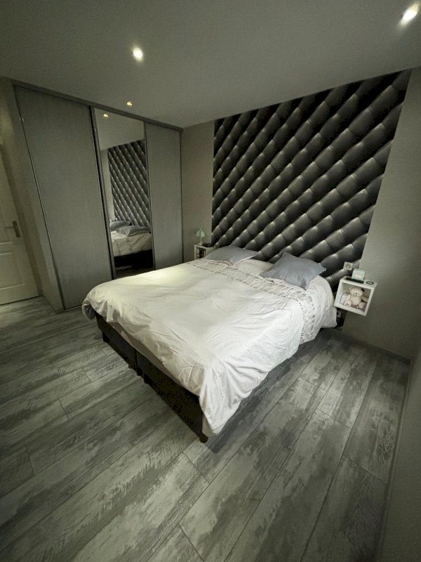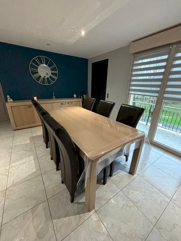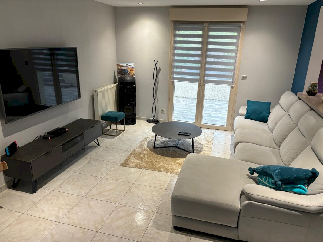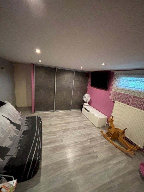 Cuisine équipée ouverte sur salon, salle à manger et son poêle à bois avec accès terrasse équipée d'un store électrique. Couloir desservant sur salle de bain avec baignoire et douche, WC suspendu indépendant et trois chambres équipées de placards à portes coulissantes. Au sous-sol halle d entrée avec deux placards , une salle de jeu ou chambre avec placard.