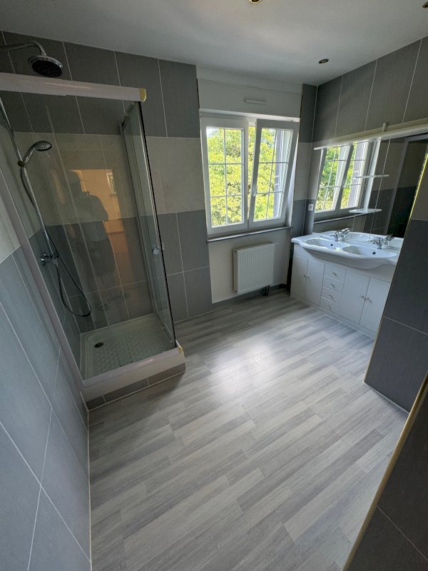 A l'étage nous avons 5 chambres , une seconde salle d'eau entièrement carrelée avec une douche et un meuble double vasques, à coté également un WC séparé.