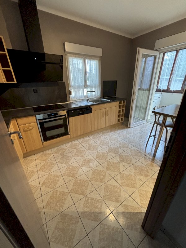 Une cuisine équipée avec véranda qui donne accès à la cour