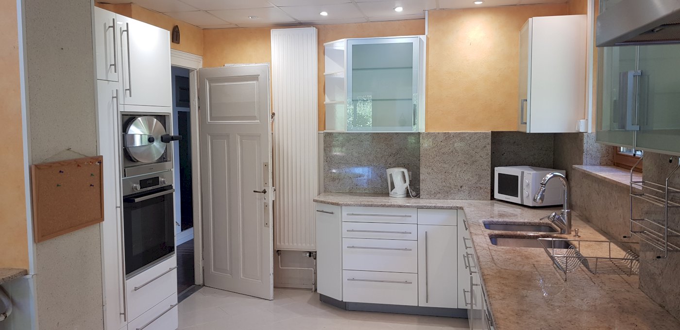 Beaux espaces de vie lumineux de 140m2: séjour avec cheminée, cuisine aménagée avec meubles laqués et électroménager, celle-ci est ouverte sur une véranda spacieuse donnant donnant sur un jardin avec piscine (5 mètres sur 5). Bureau- chambre de 12m2.