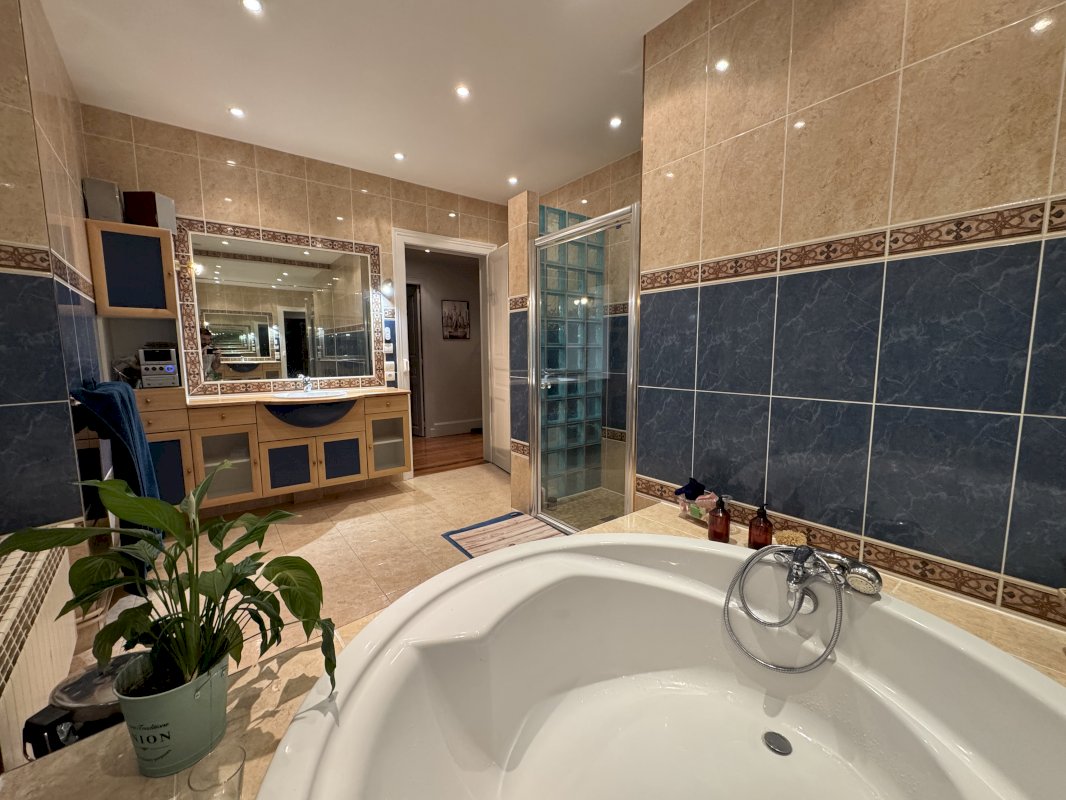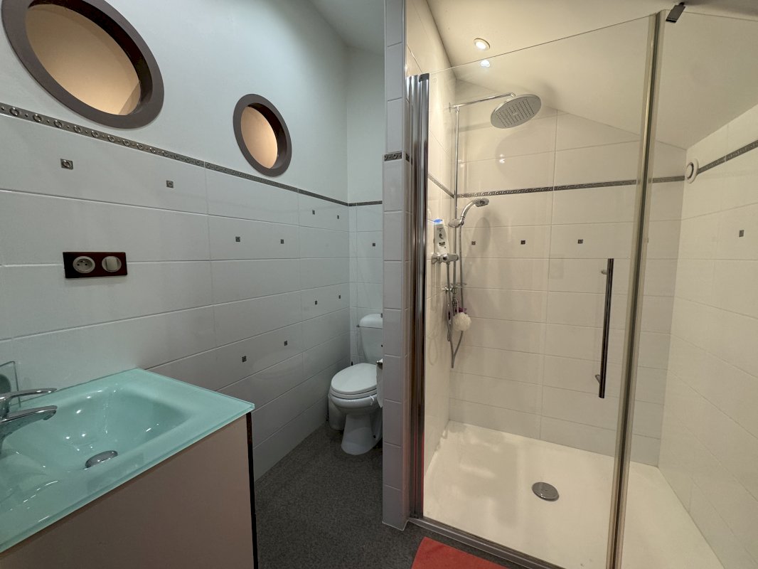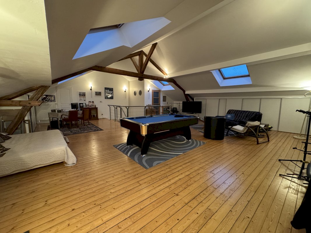 L'escalier qui monte sous un puits de jour au 2ème étage, amène à un vaste espace déplafonné de 80m2 avec bibliothèque et billard, éclairé par de très grands vélux électriques avec volets alu à détecteurs de pluie. La pièce fait office de 4ème chambre et peut facilement être transformée pour en faire deux chambres. Nombreux rangements en bas de toit et très beau volume à 3,60m sous faîtage. Une salle d'eau avec wc complète ce niveau.