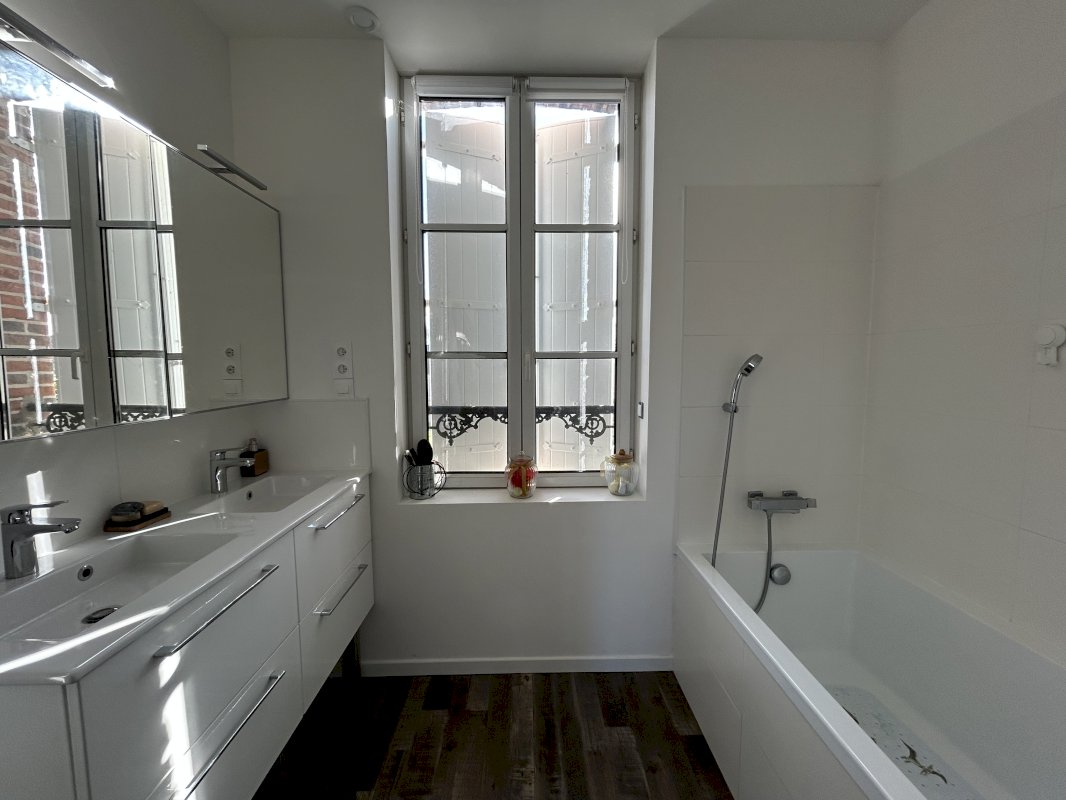 Au premier étage, le palier dessert d’un côté une salle de douche avec WC et une suite parentale de près de 25 m² avec sa salle de bain double vasque. De l’autre côté, le couloir vous mène à deux chambres de plus de 20 m² chacune ainsi qu’un bureau.