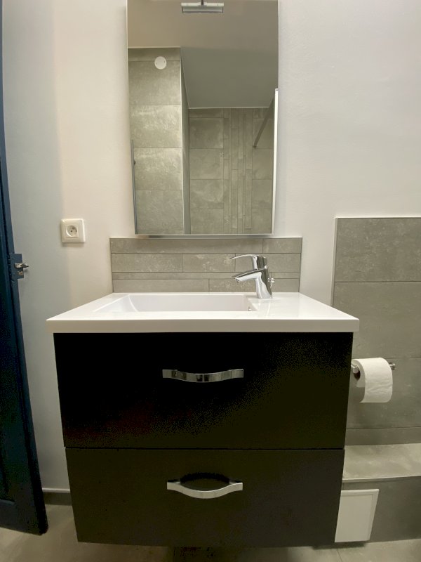 Une entrée , un grand salon / séjour , deux chambres, une cuisine séparée aménagée et équipée ( plaque de gaz , four , hotte ) et une salle de bain avec douche italienne .