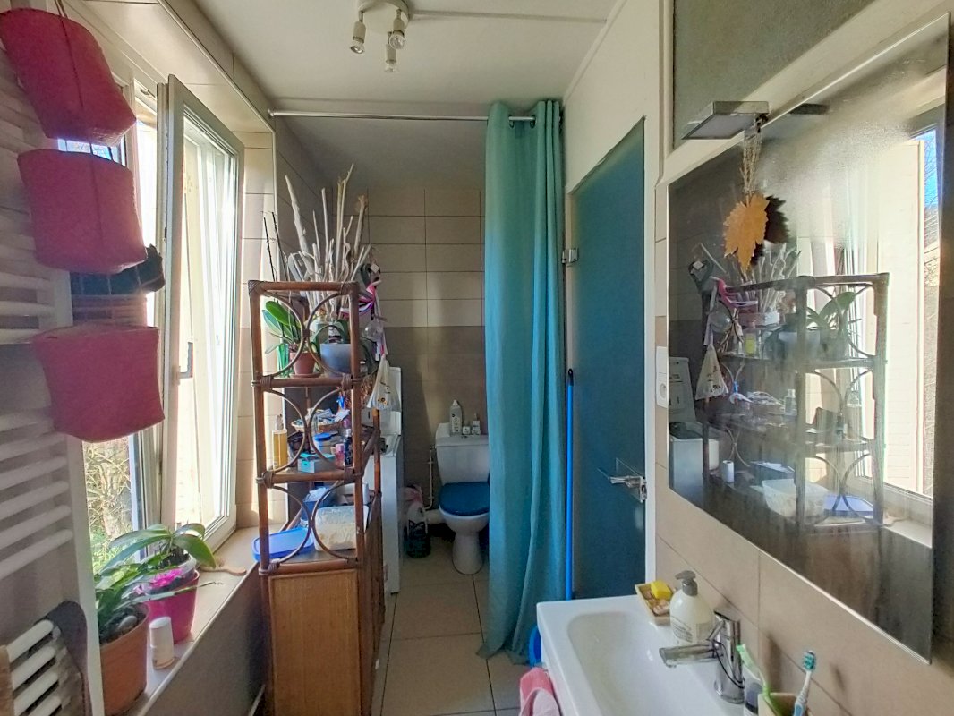 3 chambres (1 en bas, 2 à l'étage), 1 mezzanine, 2 sdb (une avec baignoire en bas, 1 avec douche en haut), 2 WC (1 à chaque niveau), 1 cuisine ouverte sur la pièce menant à l'étage, plaque induction Electrolux neuve (2022).