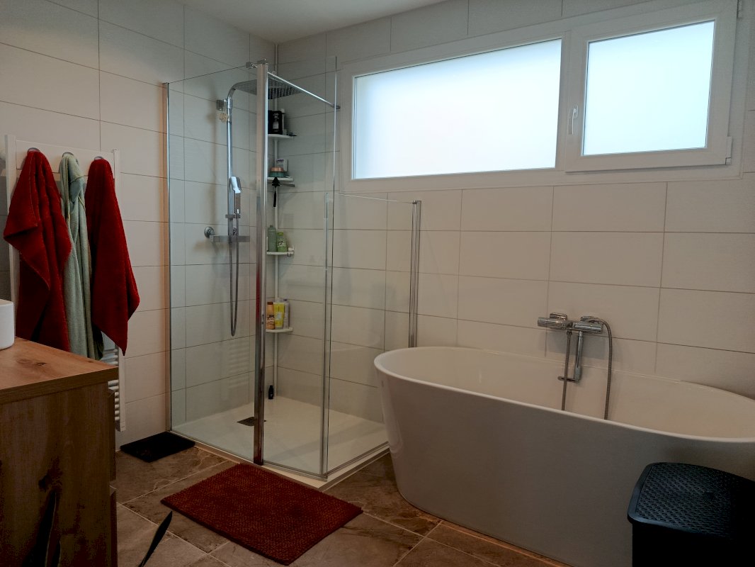 A l'étage : une belle cuisine toute équipée dans un espace complètement ouvert avec un beau séjour traversant de 49 m²avec poêle à bois. Espace très lumineux avec une grande baie vitrée donnant sue une terrasse qui fait toute la longueur de l'arrière de la maison. Une grande salle de bain avec une douche à l'italienne et une baignoire.