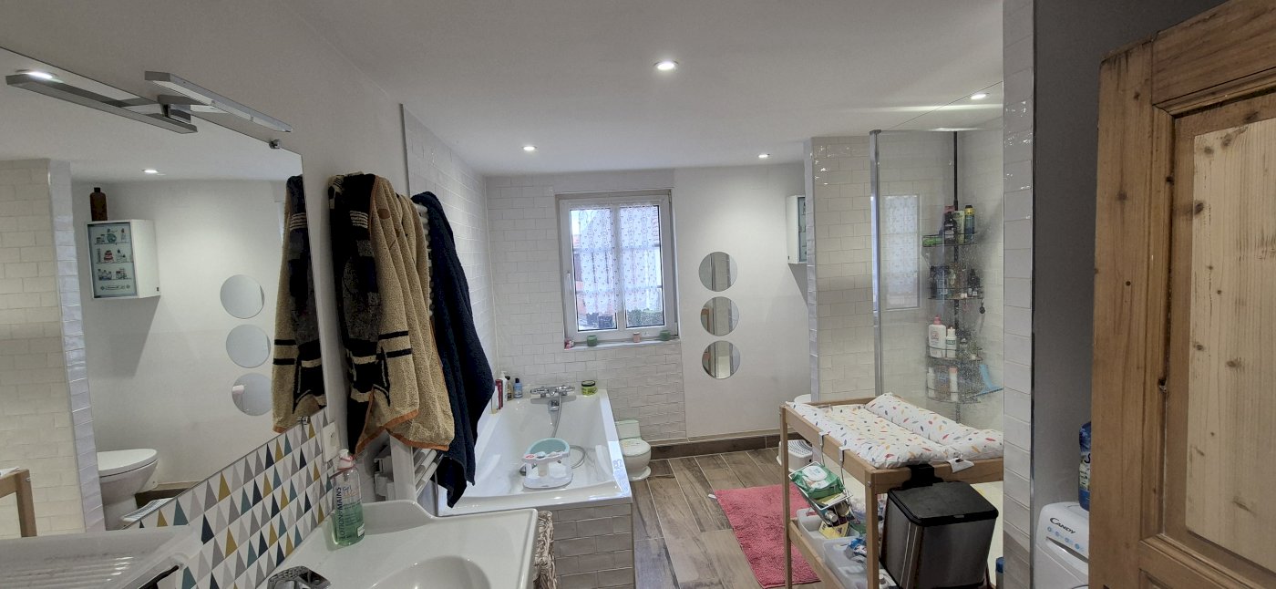 - Une salle de bain avec une grande douche et une grande baignoire ainsi qu’un WC. (Chauffe-eau récent)