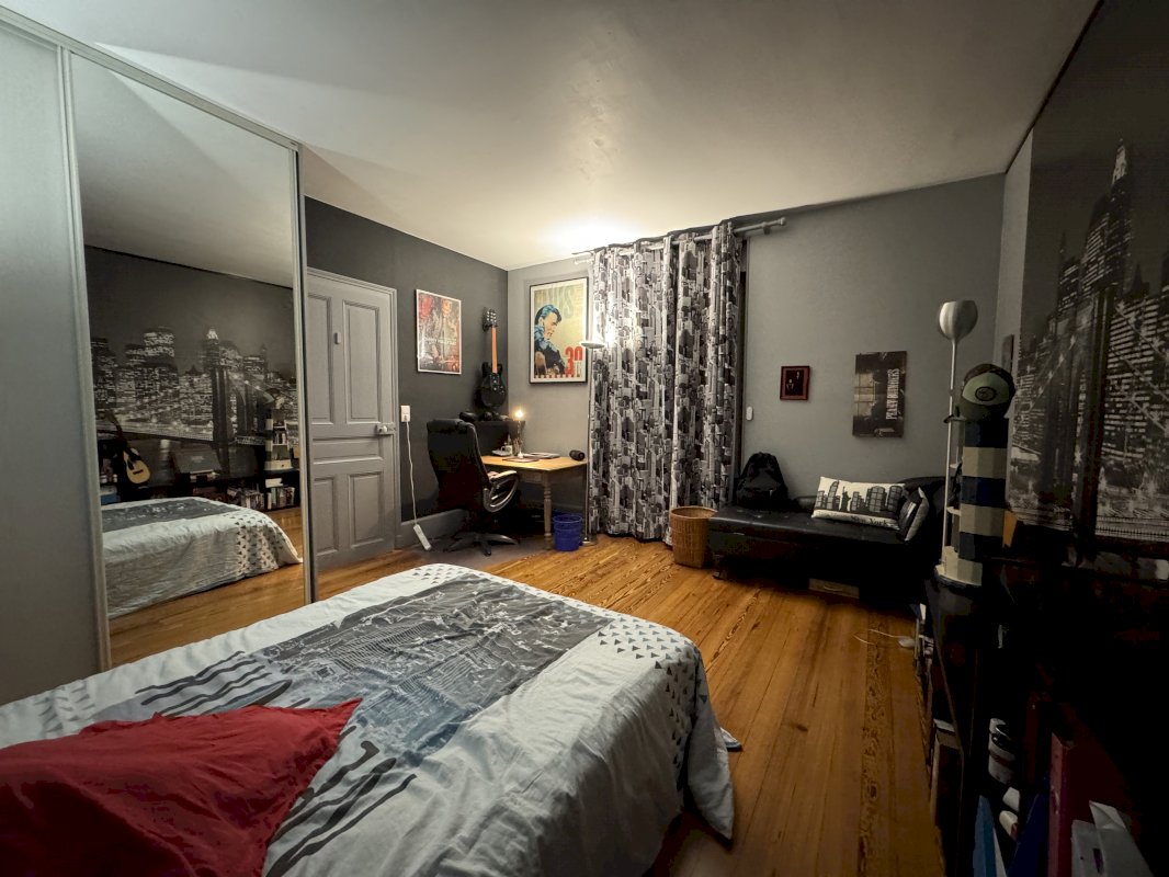 Au rez-de-chaussée, l'entrée protégée par une jolie marquise, dessert une cuisine équipée de 17m2, un séjour de 44m2 avec 3,2m de hauteur sous plafond, un bureau aménagé, une salle de douche/ buanderie et un wc séparé.