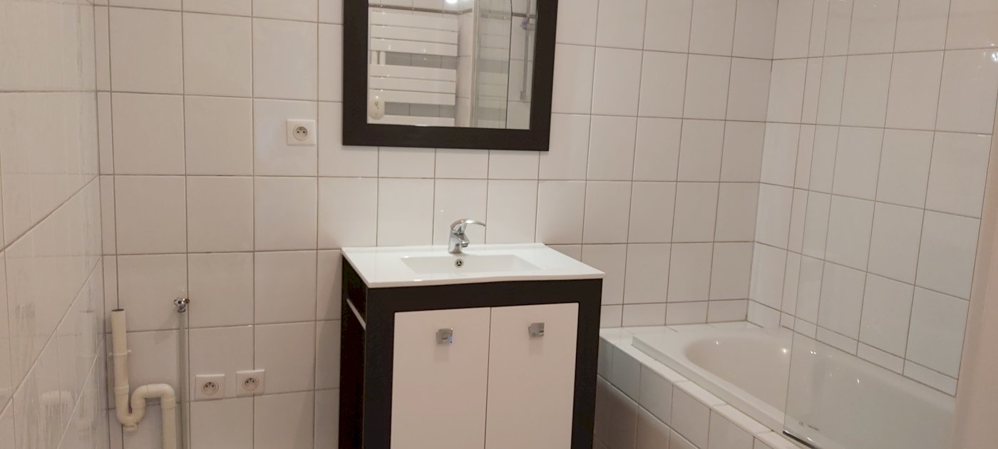 Une salle de bain avec baignoire, meuble de rangement, sèche serviettes et emplacement pour machine à laver, WC séparés avec lave-main.