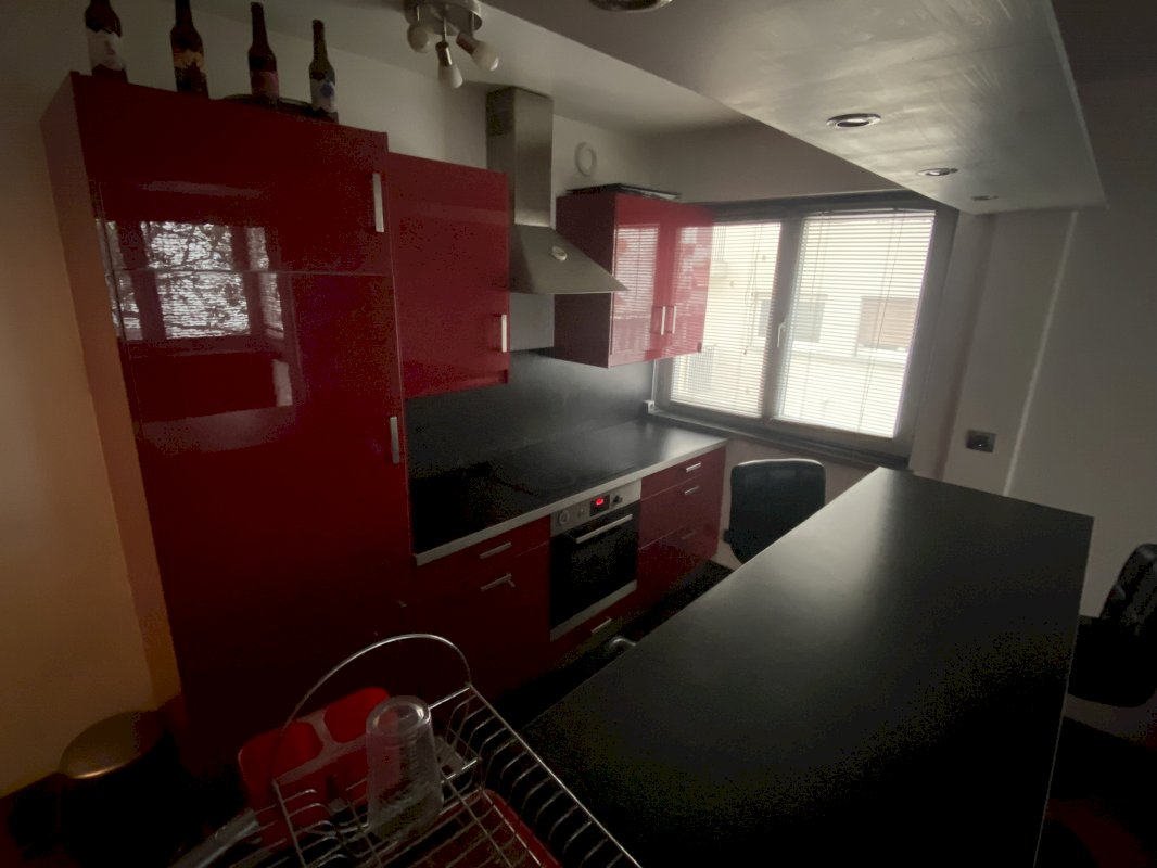 une entrée avec placards muraux, une salle de bain avec baignoire, vasque sur meuble et wc, une grande chambre (13,8 m²) avec placards muraux, une belle pièce principale (20,8 m²) cuisine ouverte meublée et équipée (réfrigérateur, congélo, plaque de cuisson, four, lave linge), séparée avec un bar