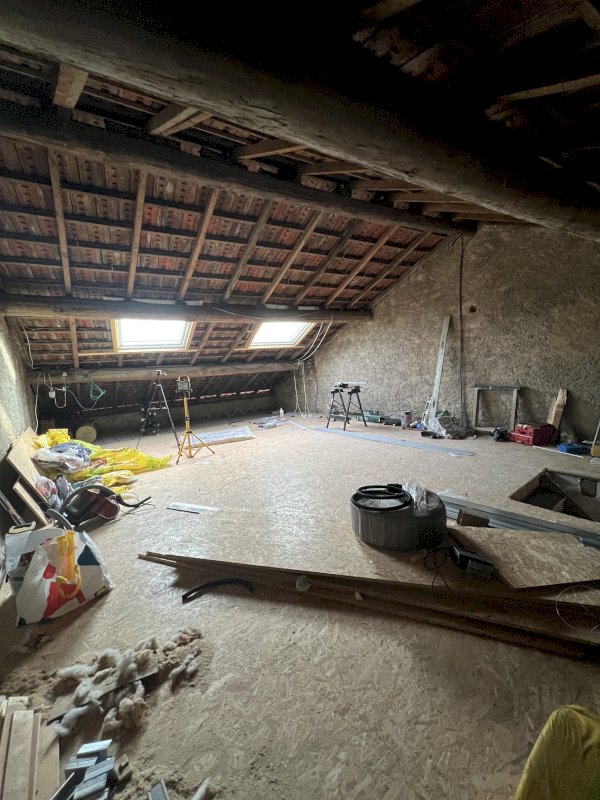 • Un grand couloir (en cours d’aménagement avec possibilité de mettre un deuxième WC) menant à un grenier de 35m² (pour une chambre parentale avec dressing ou possibilité de faire 2 pièces), déjà équipé de 2 Velux avec volets électriques et d’un plancher OSB, offrant un potentiel supplémentaire