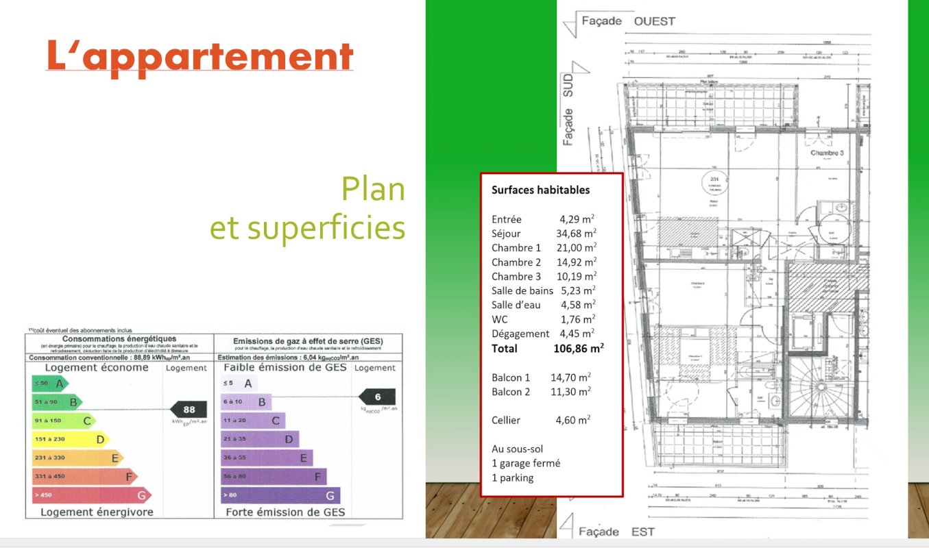 Comprenant : Entrée avec placard, salon-séjour avec cuisine équipée donnant sur un grand balcon (14,70 m2), suite parentale de 20 m² avec placard et salle de bains avec WC et accès à un grand balcon, (11,30 m2) 2 autres chambres avec rangements, salle de douche, wc séparé, cellier en rez-de-chaussée, en sous-sol: garage fermé automatisé + place de parking.