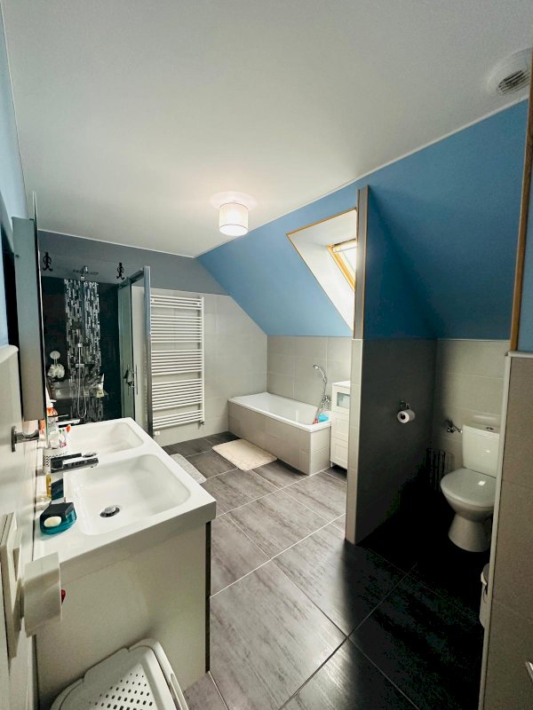 - A l'étage: trois belles chambres de plus de 13 m2 chacune, dont une chambre est équipée d'un dressing, une grande salle de bain équipée d'un meuble double vasque, une douche, une baignoire, et un WC.
