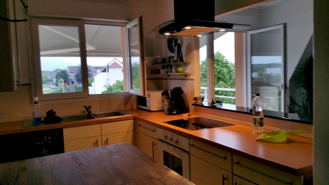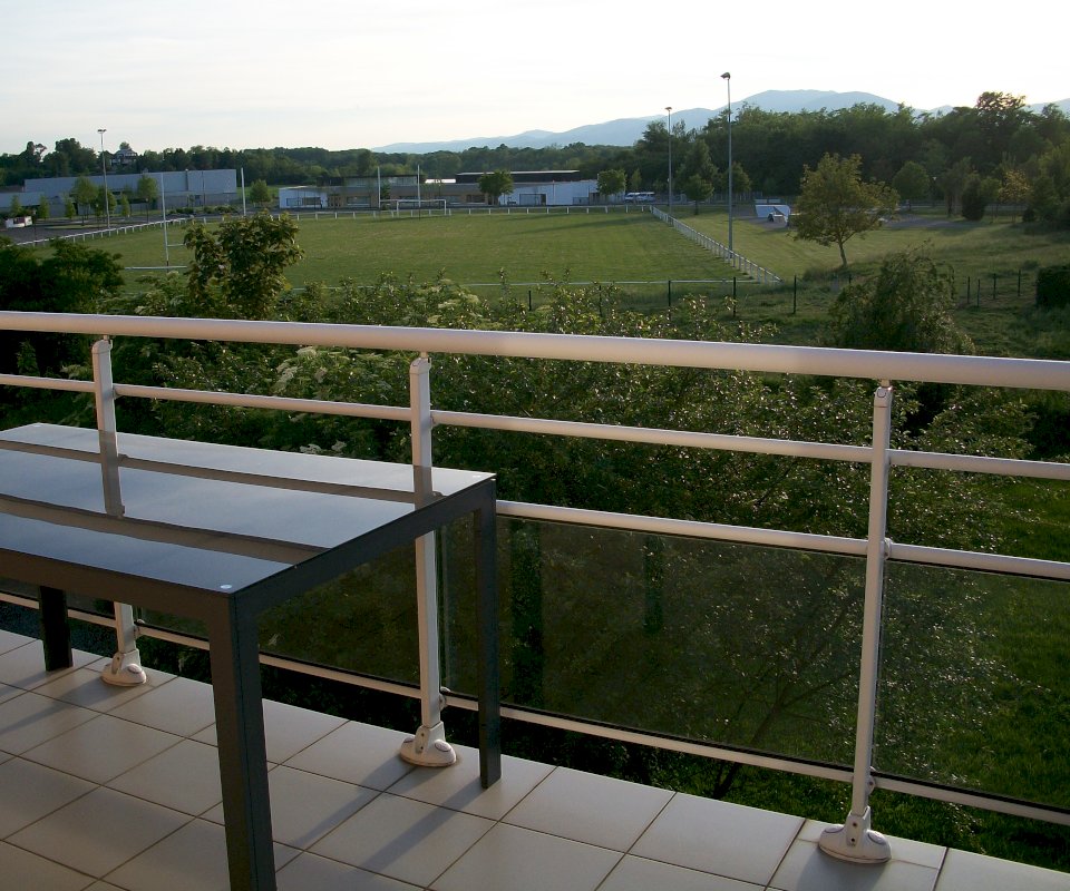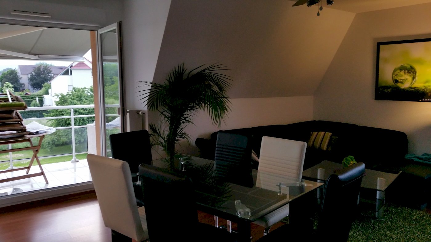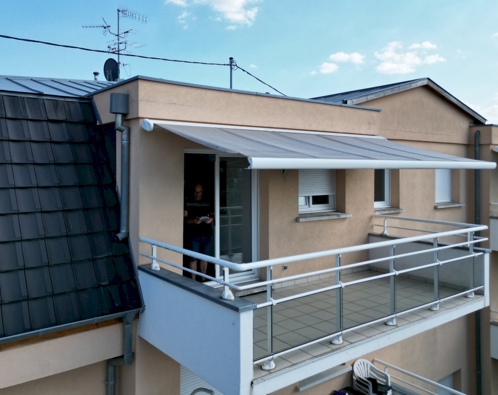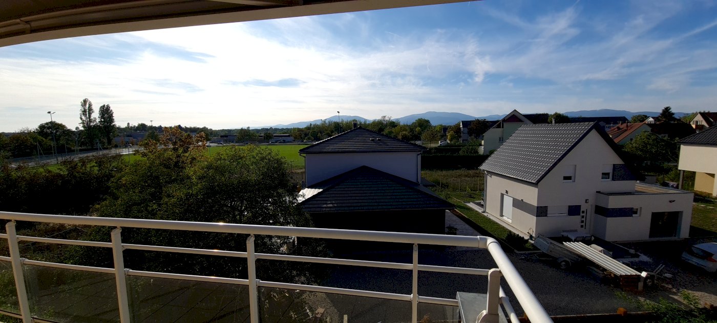 Balcon 9 m² couvert par un store banne électrique, vue sur les Vosges, pas de vis à vis.